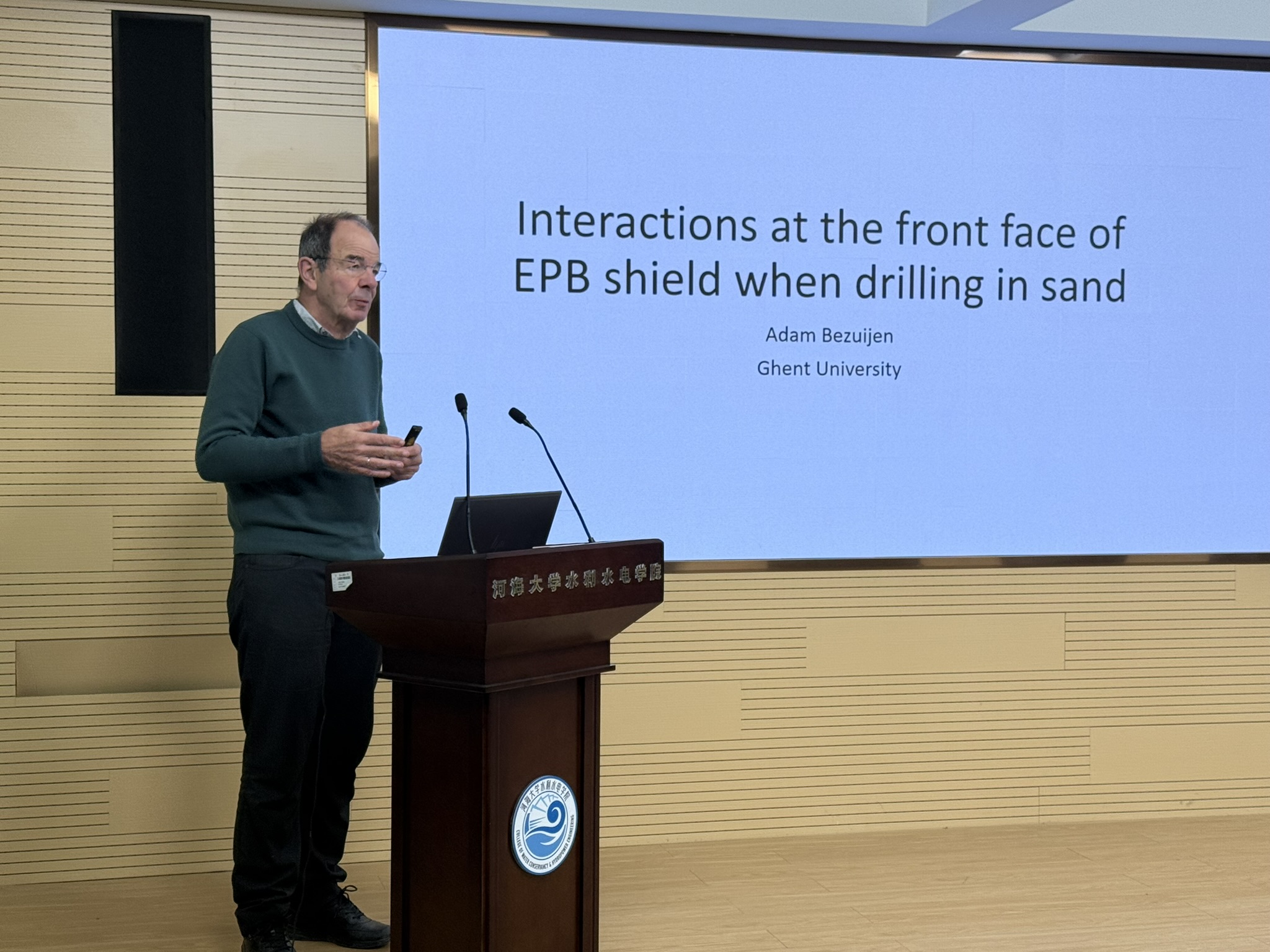 2025年11月19日上午,学院在水电馆301会议室成功举办学术研讨会。应王媛教授邀请,比利时根特大学Adam Bezuijen教授访问我校,并作了题为“砂土地层盾构掘进掌子面相互作用机制”的学术报告。本次报告旨在深化对复杂砂土地层中盾构掘进机理的认识,揭示“土体-盾构-地下水-泡沫”相互作用机制,为盾构掌子面精细化控制及施工安全风险防控提供科学依据和技术支撑。
