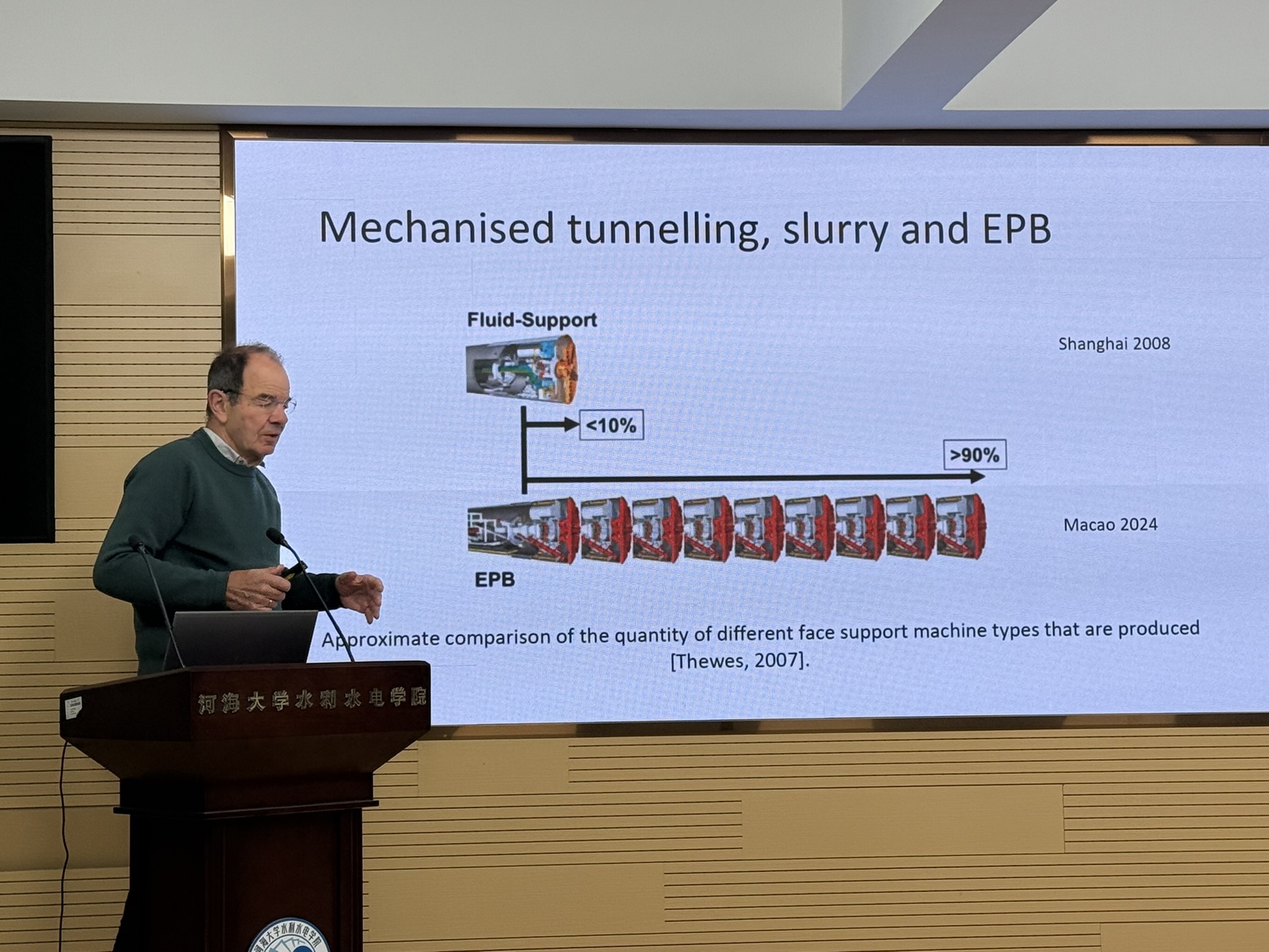 Adam 教授从砂土地层中 EPB(Earth Pressure Balance)盾构掘进的典型工况切入,系统讲解了掌子面前方超孔隙水压力的形成机理,并深入剖析砂土渗透性、掘进速度与泡沫渗入行为之间的耦合作用。他指出,泡沫“半衰期测试”本质上反映其渗透能力,测试结果受容器尺寸、排水条件等试验边界影响显著,因此现行标准有必要进一步统一,以提升不同实验室之间的可比性和数据可靠性。