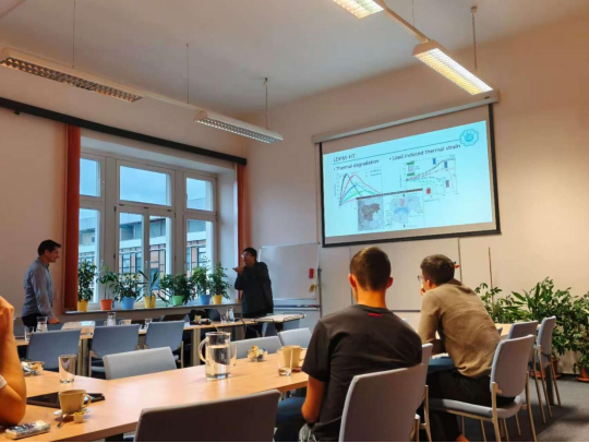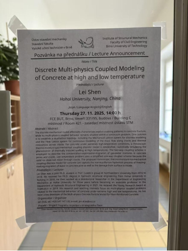 访问期间,沈雷副教授于2025年11月27日(布拉格时间)在布尔诺理工大学土木工程学院作了题为《Discrete Multi-physics Coupled Modeling of Concrete at high and low temperature》的学术报告。报告系统介绍了基于混凝土离散力学本构的多场耦合分析方法,及其在极端高温与低温环境下的工程应用进展。45分钟的汇报吸引了众多师生参与,现场交流热烈,反响积极。