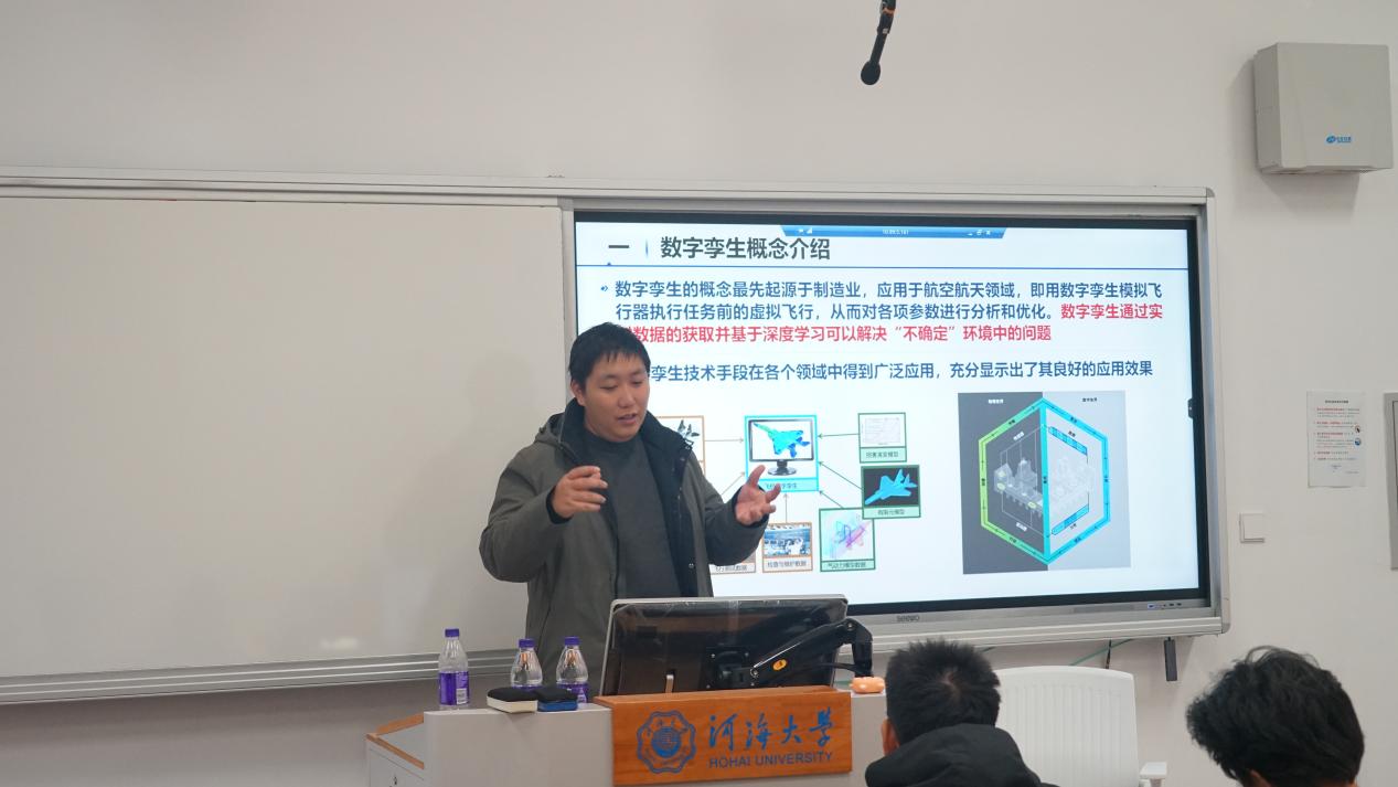 活动现场,邵晨飞老师带来了干货满满的学术分享。讲座紧扣智慧水利建设核心需求,聚焦数字孪生水利工程构建技术的前沿痛点,针对行业内长期存在的虚实交互实时性弱、数字场景融合度低等关键瓶颈,邵老师系统展示了团队在精准映射与智能感知方向的理论探索和技术攻关成果。从多源异构数据有效信息提取的创新算法,到工程结构性态场信息解译的核心技术,再到智能监控预警与工情水情融合的技术框架,团队成员结合多个实际水利工程应用案例,生动呈现了数字孪生技术在提升水旱灾害防御能力、优化水资源配置中的落地成效,为在场学子直观展现了智慧水利技术从实验室走向工程现场的全流程,也为水利工程数字化、智能化转型提供了可借鉴的实践方案。