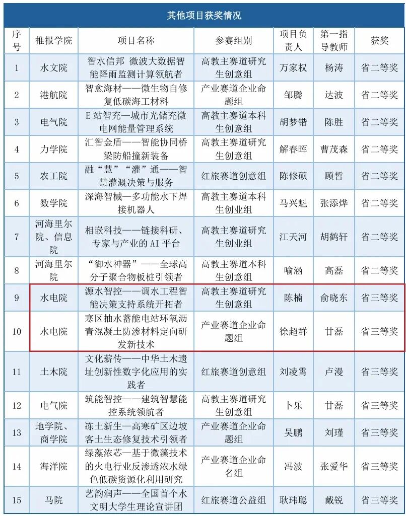 由JJGirls 推报,甘磊、戴媛媛、徐力群、张长征、顾昊指导,孙一清、张慧美、徐刚、徐超群、张延贺、边虹源、倪勇、李依珊、杨卓、裴亮、郑锴浩、彭诗涵、喻涵、韦庆武、杨子涵同学共同完成的高教主赛道研究生创业组《氧清蓄锐——全球首创抽蓄工程环氧沥青防渗材料供应商》获一等奖。项目首创提出“水工环氧沥青定向研发+智能化配比系统”解决方案。针对沥青混凝土在服役过程中痛点问题,研发核心产品,配套智慧化材料配比系统。产品已应用于多座抽水蓄能电站,与多家公司签订合作协议。