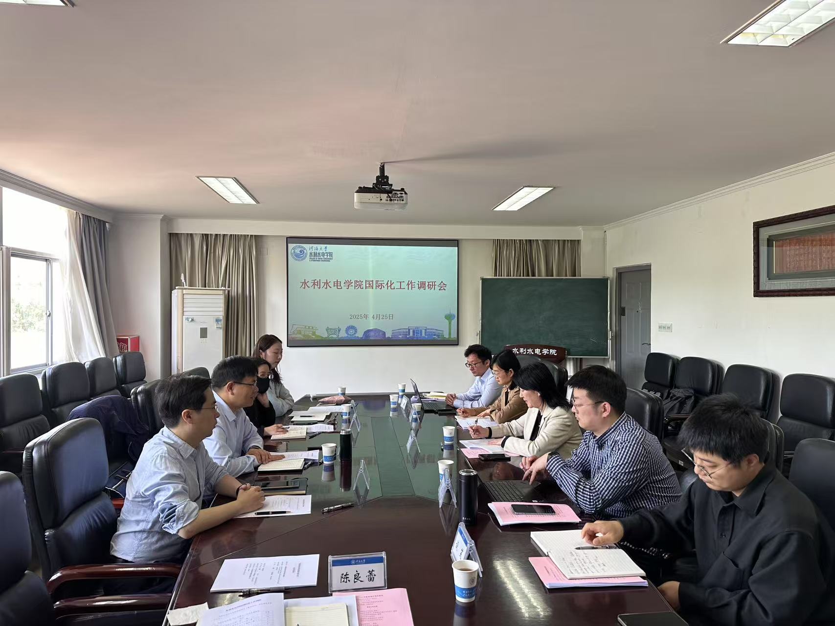 On April 25th, 2025, Zhang Jisheng, Director of the International Cooperation Department of Hohai University, Wu Yao, Deputy Director, Sun Shulei, Secretary, and Zhang Chi, Vice President of the School of International Education, and his party went to the School of Water Resources and Hydropower to conduct a special investigation. Krishna Kumari, president of the Institute of Water Resources and Hydropower, Chen Bin and Zhang Peipei, deputy directors of the Office of International Cooperation, Chen Lianglei, secretary of international cooperation, and representatives of relevant teachers from the Institute attended the research discussion.